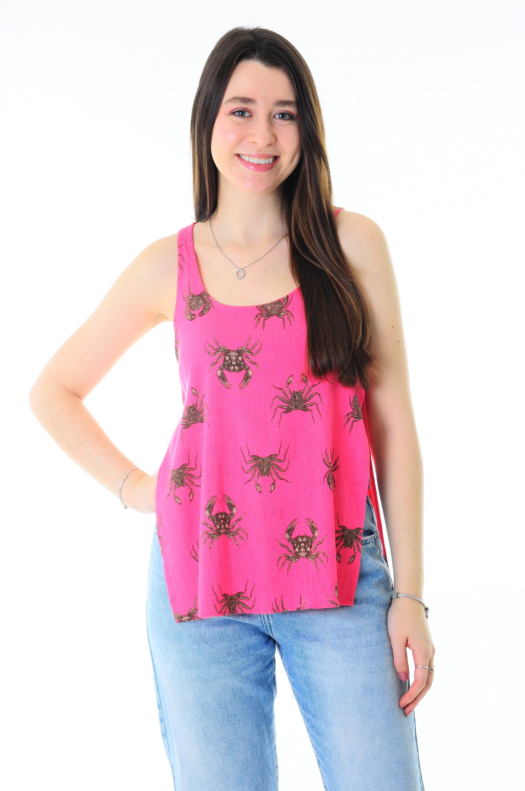 Essa blusa da Farm é puro frescor e alegria! Com estampa divertida de caranguejos, ela traz um toque leve e descontraído para os dias quentes. Ideal para compor looks casuais e cheios de personalidade — fica linda com shorts, saias ou calças jeans.