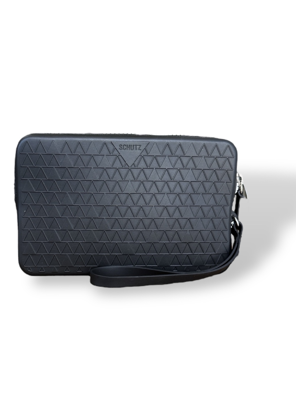 A Bolsa Clutch Schutz apresenta uma pequena alça lateral com fechamento superior em zíper na cor branca.