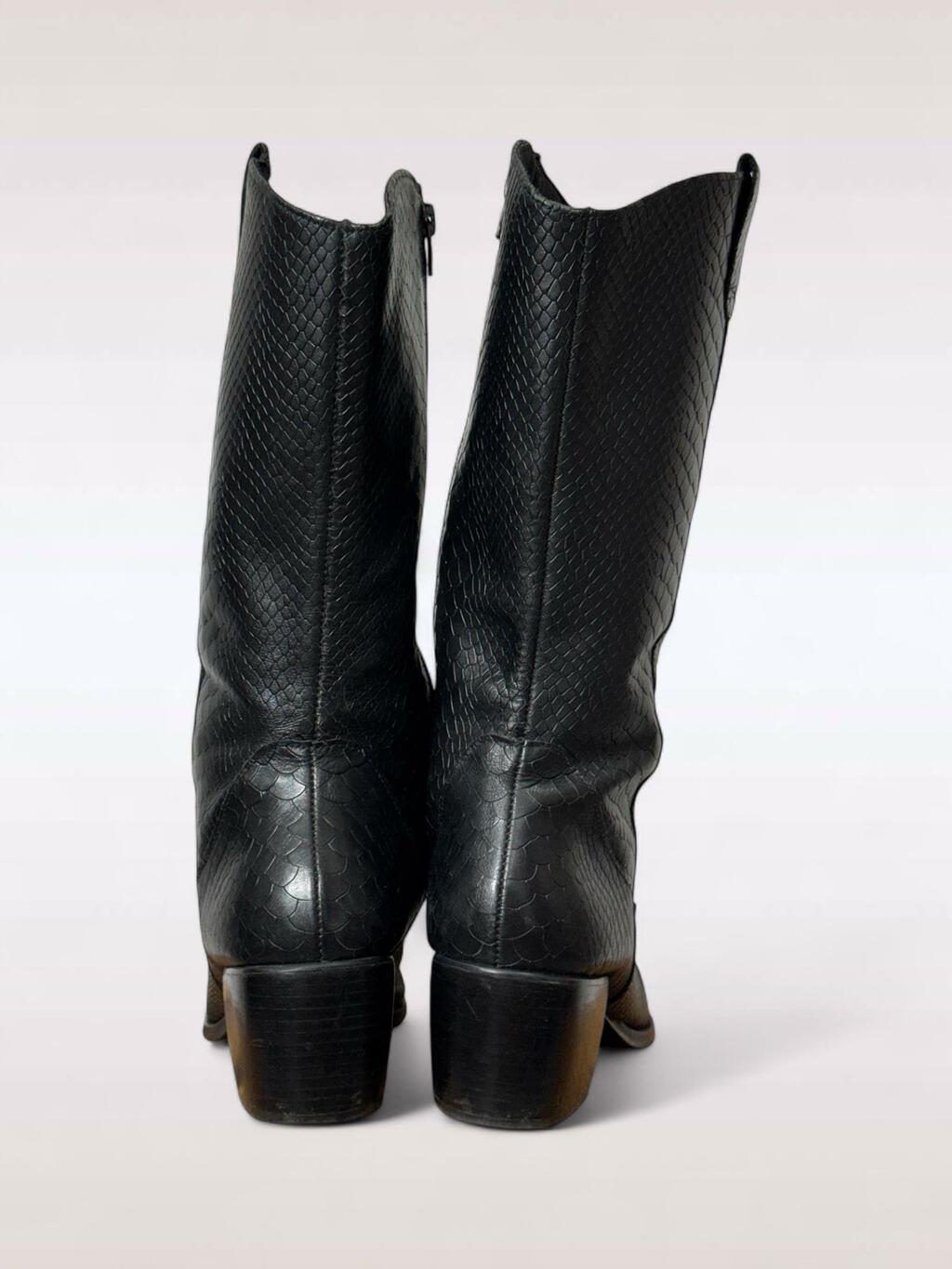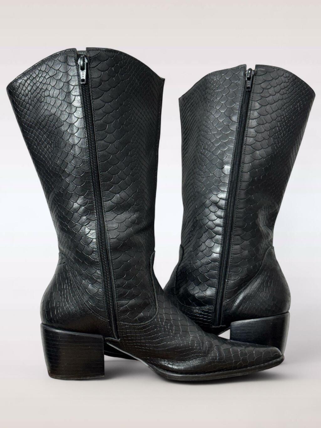 Com bico fino, salto médio e textura que remete à pele de crocodilo, essa bota da Twinset traz a autenticidade do estilo country com o acabamento impecável do couro legítimo. O cano médio com zíper lateral garante praticidade no vestir, enquanto o recorte tradicional valoriza o visual com personalidade.