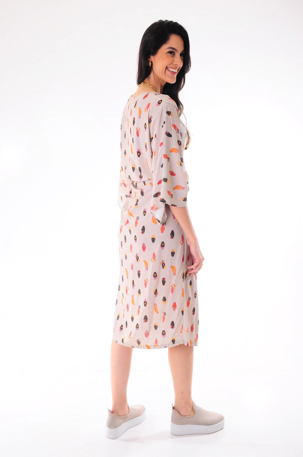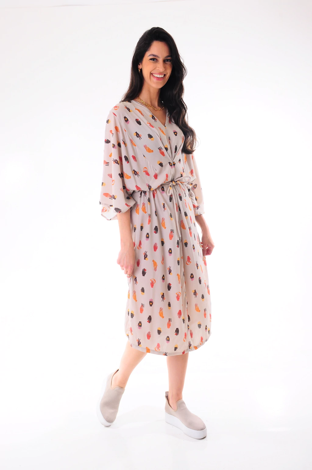 Confeccionado em tecido fluido com estampa exclusiva de mãos coloridas, ele possui modelagem solta, mangas amplas ¾ e decote com drapeado frontal que valoriza o colo com elegância.